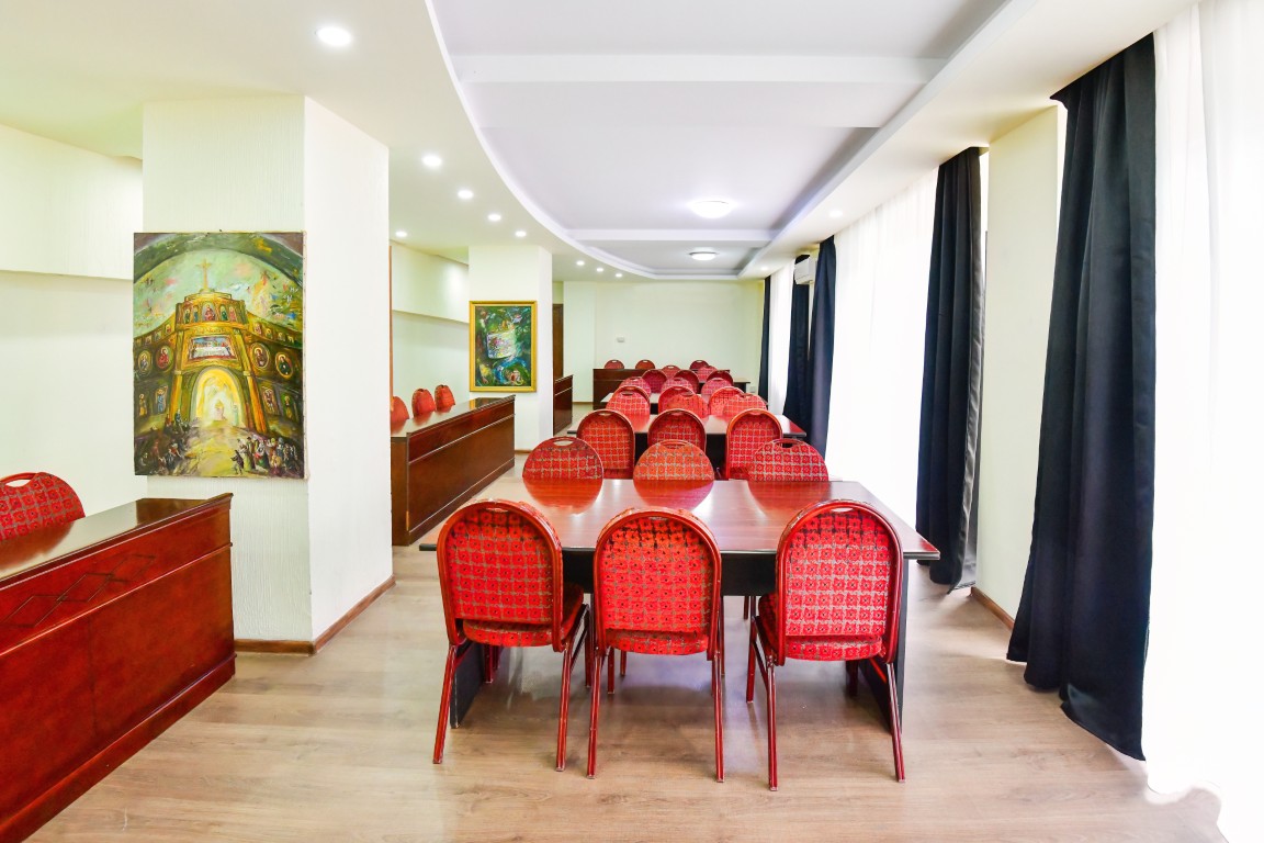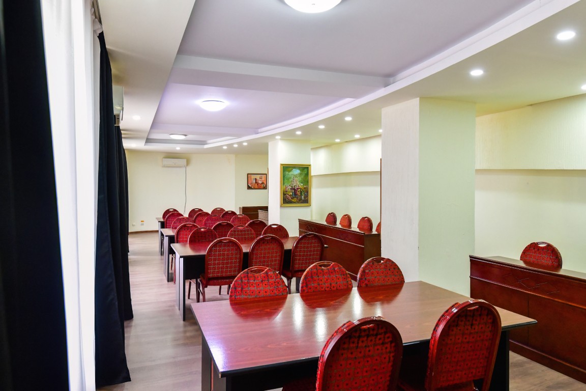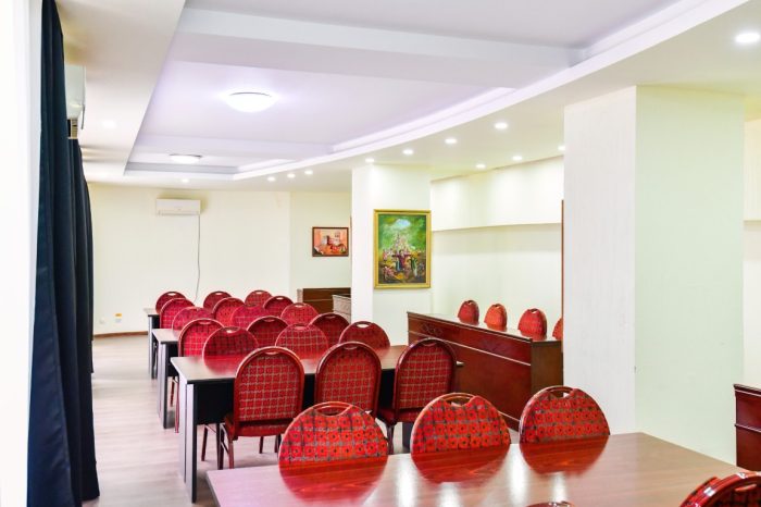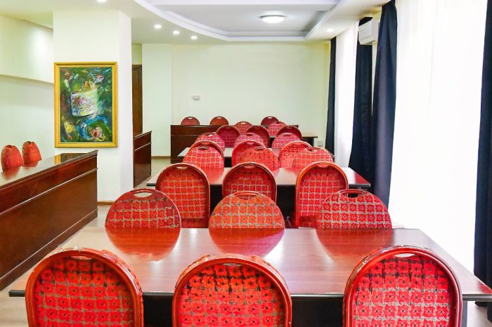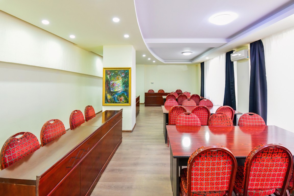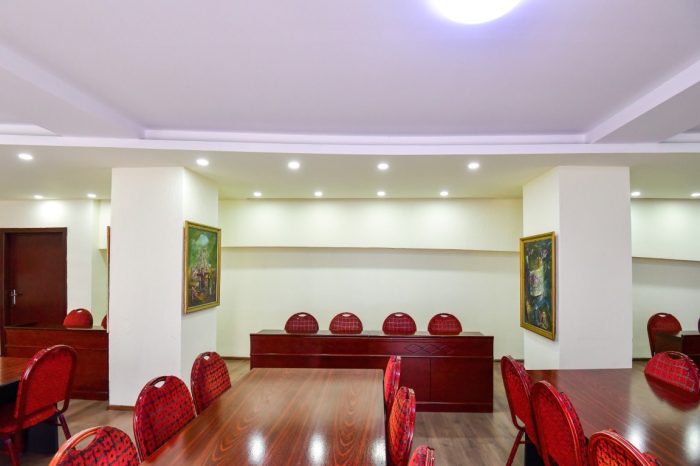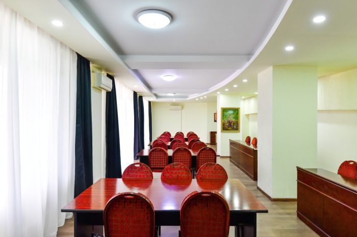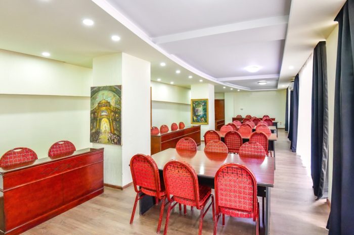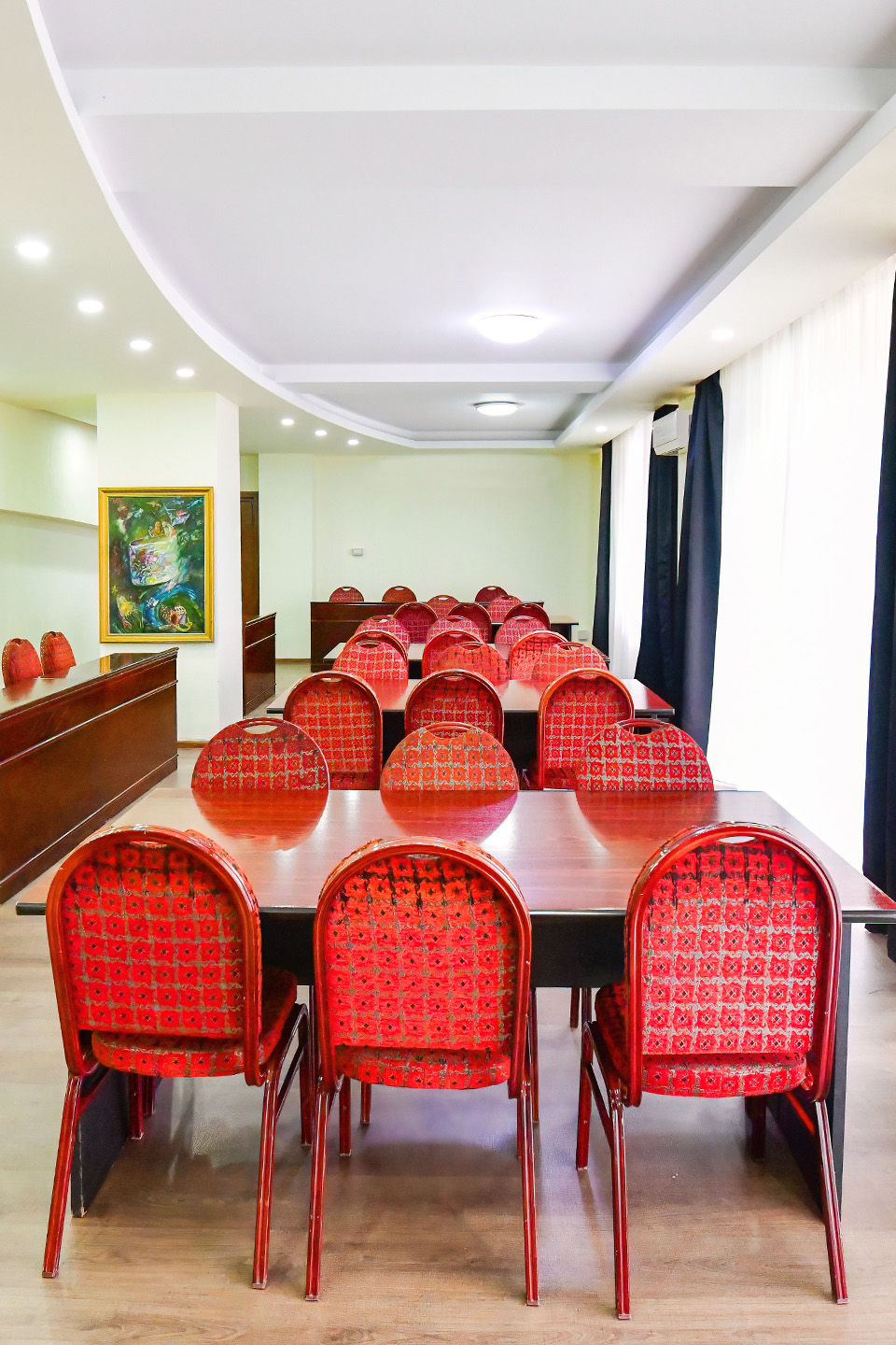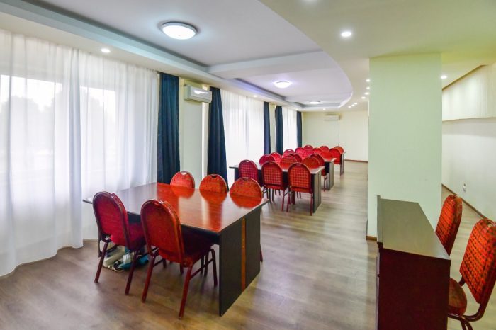 Sala de conferințe a hotelului nostru este spațiul ideal pentru organizarea de întâlniri de afaceri, prezentări, traininguri sau evenimente corporate într-un cadru modern și confortabil. Amenajată cu atenție la detalii, sala dispune de toate facilitățile necesare pentru desfășurarea unor evenimente reușite: sistem de sonorizare performant, proiector, ecran de proiecție, conexiune Wi-Fi stabilă și mobilier modular, ce permite configurarea sălii în funcție de tipul evenimentului.